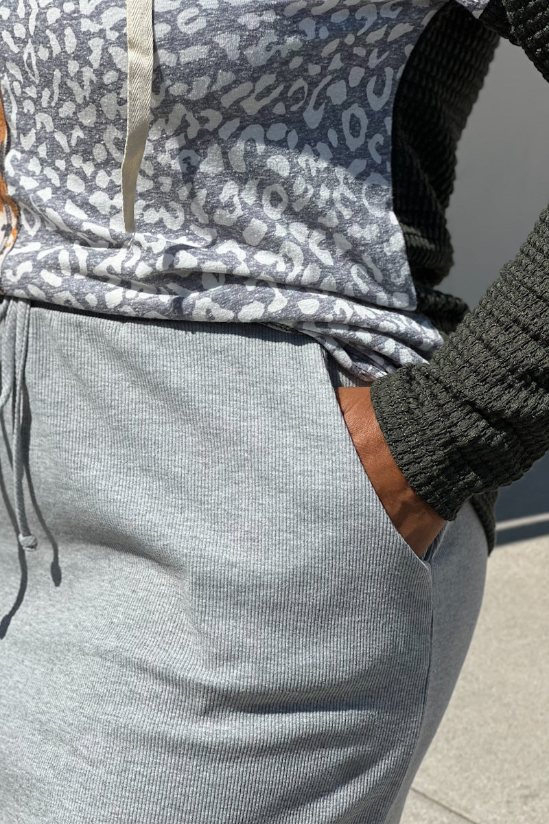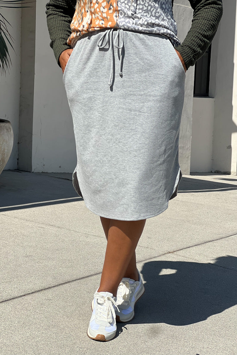 Solid ribbed midi skirt with elastic waist, side pockets, and rounded hem