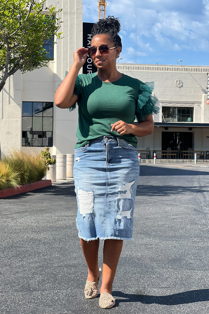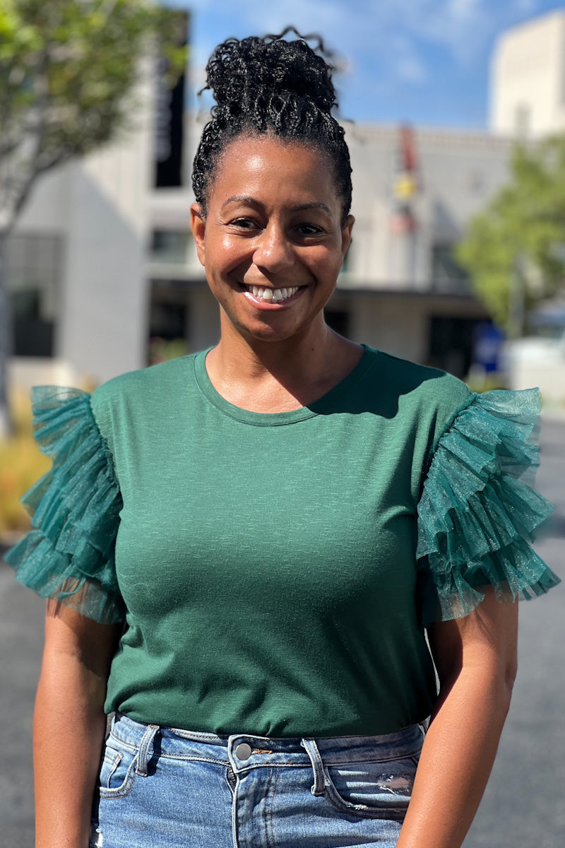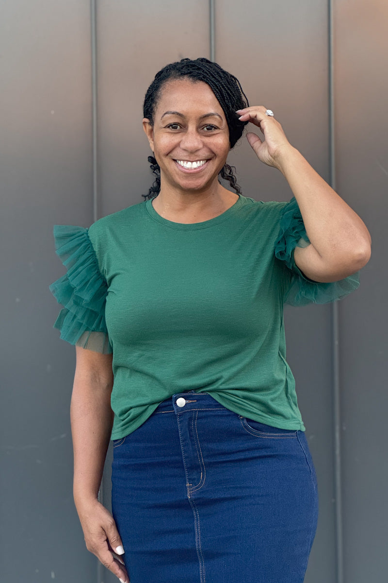 Hunter Green Top w/ Tulle Ruffle Sleeve